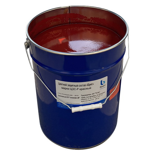 "Брит" ЦЗС красный, желтый, белый, синий, зелёный СТО 77310225.020 – 2019. Цветные защитные составы "Брит" (ЦЗС) относятся к пленкообразующим материалам для обработки различных видов дорожных покрытий. Выпускаются в виде дисперсии минерального наполнителя в связующем веществе из полимерного состава в органическом или водоэмульсионном составе. Использование пигментных добавок позволяет придать покрытию белый, красный, желтый, зеленый или синий оттенок, а также другой цвет, если это предусматривает требование заказчика.