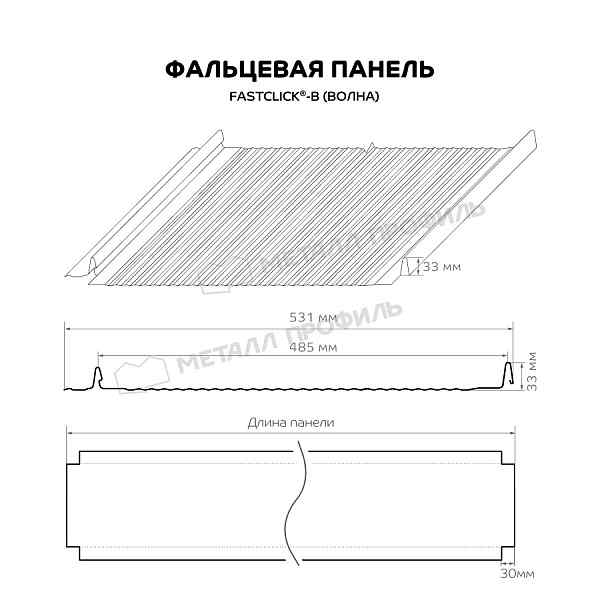 Что касается размеров, то Фальцевая панель Металл Профиль FASTCLICK-В (VALORI-20-DarkGrey-0.5) отличается оптимальными параметрами: лёгкую картину шириной 531 мм удобно монтировать, а замки высотой 33 мм обеспечивают плотное соединение. Длину панели можно подобрать, она варьируется от 0,5 до 12 метров.