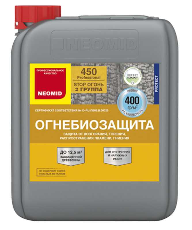 NEOMID 450 защищает древесину на срок до 7 лет от возгорания и распространения пламени, обеспечивая II группу огнезащитной эффективности согласно ГОСТ Р 53292 (переводя древесину в трудновоспламеняемый материал), и на срок 8-10 лет от гниения, возникновения плесени, при отсутствии контакта с влагой.