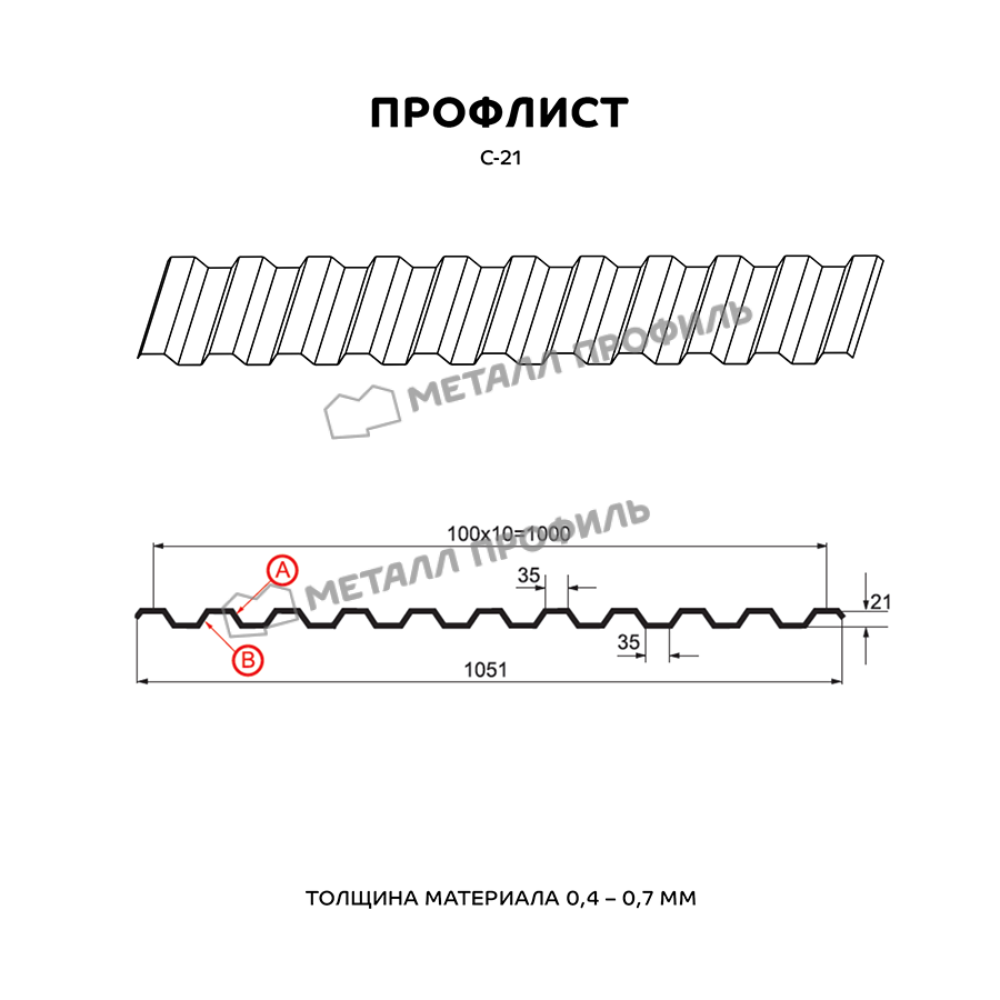 Профиль С-21 имеет трапециевидную форму, что обеспечивает прочность и устойчивость к нагрузкам. Толщина материала составляет 0,5 мм, что делает его легким и удобным в использовании.