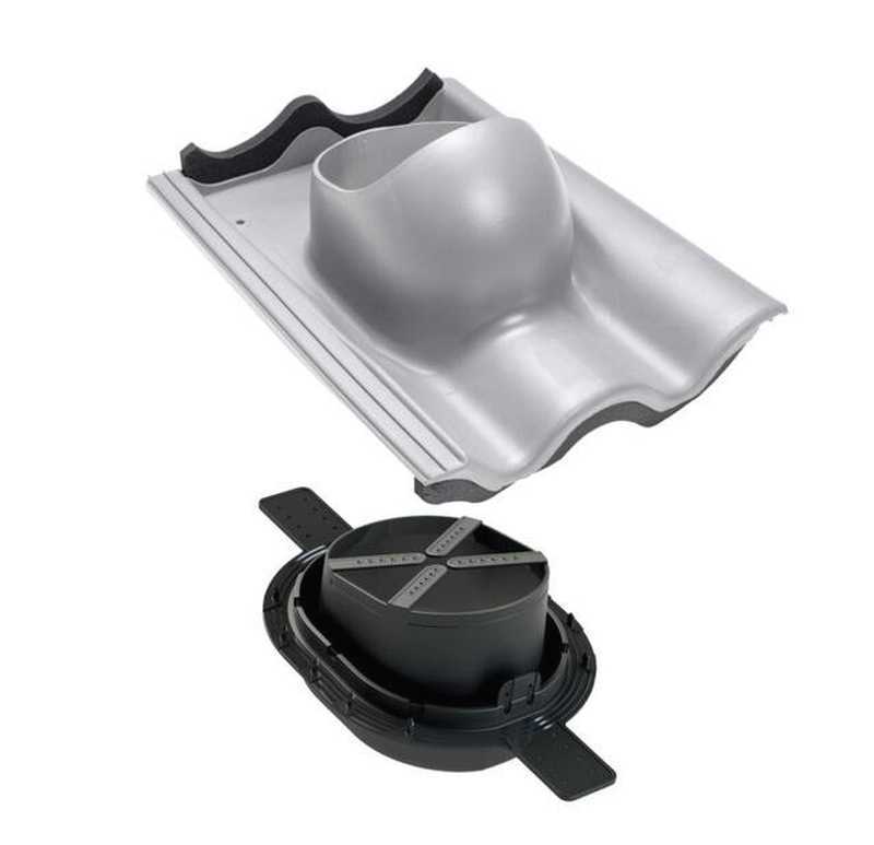 Проходной элемент для цементно-песчаной черепицы. Заменяет одну двухволновую черепицу шириной 330 мм и высотой волны 27 -40 мм. В комплект входит двухкомпонентный 2K -уплотнитель гидрозатвора, гарантирующий полную герметичность прохода через гидрозащитную пленку. Устанавливается при монтаже и на готовую кровлю.